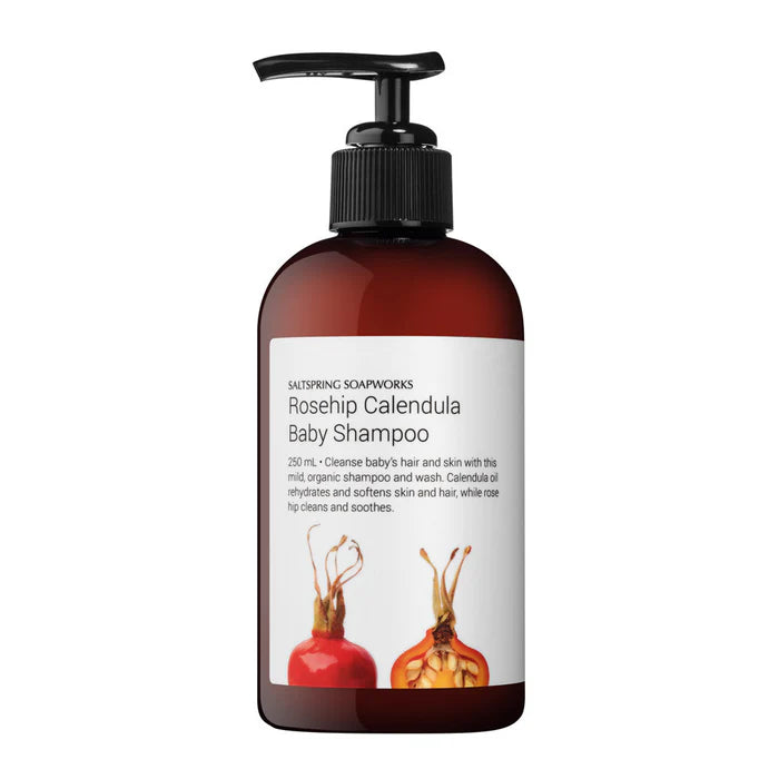 Our Rosehip Calendula Baby Shampoo is a mild, organic, shampoo and wash. Rose hip gently cleans and soothes your baby’s hair and skin. Calendula oil rehydrates and softens skin and hair. It’s lathers nicely, and leaves skin moist and healthy.