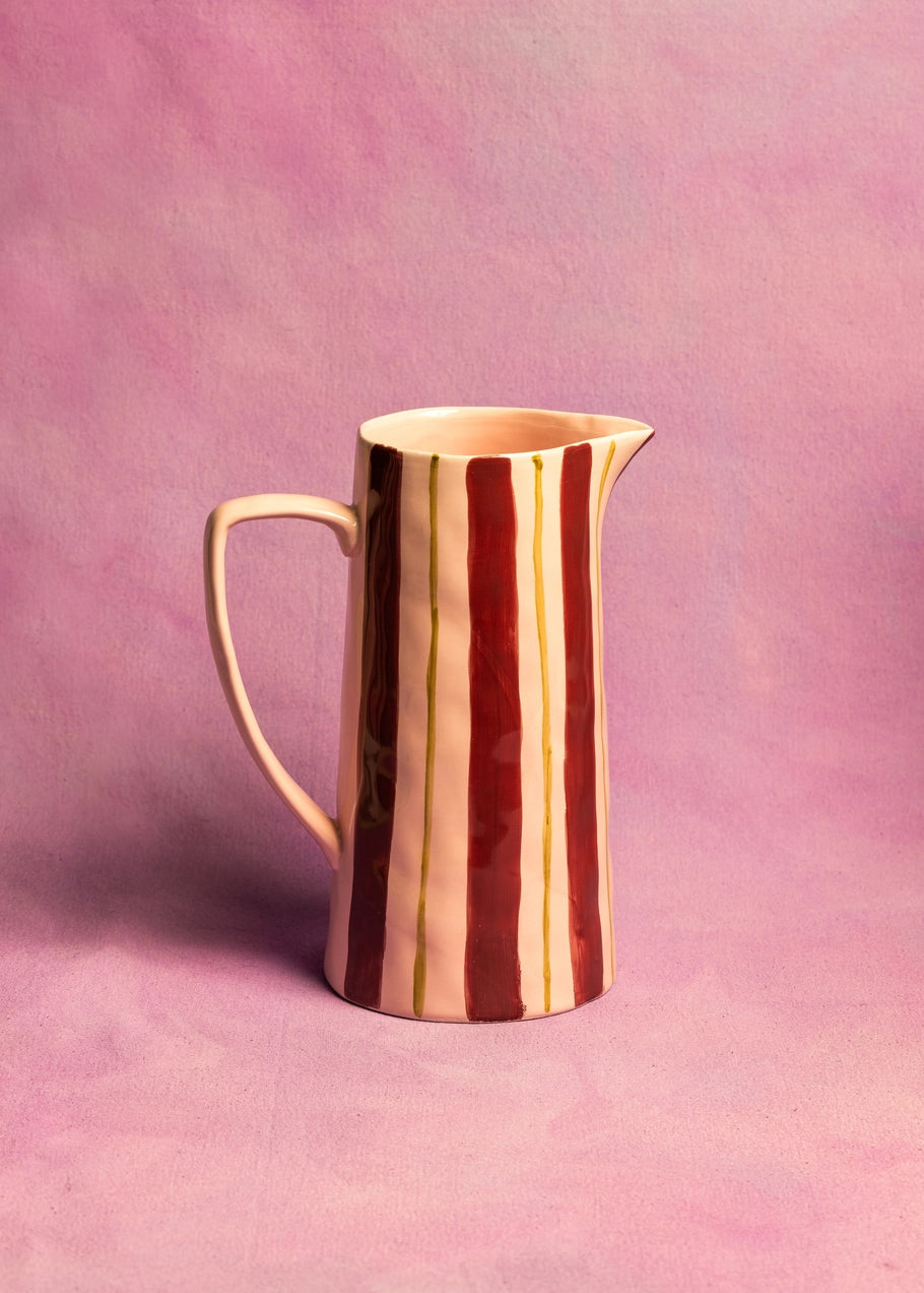 Pink/ Burgundy Jug Featuring a soft light pink glazed base, accented with deep burgundy stripes and a hand-painted ochre detail. Bring character and charm to your home with Maegen’s hand-painted ceramic striped jugs.