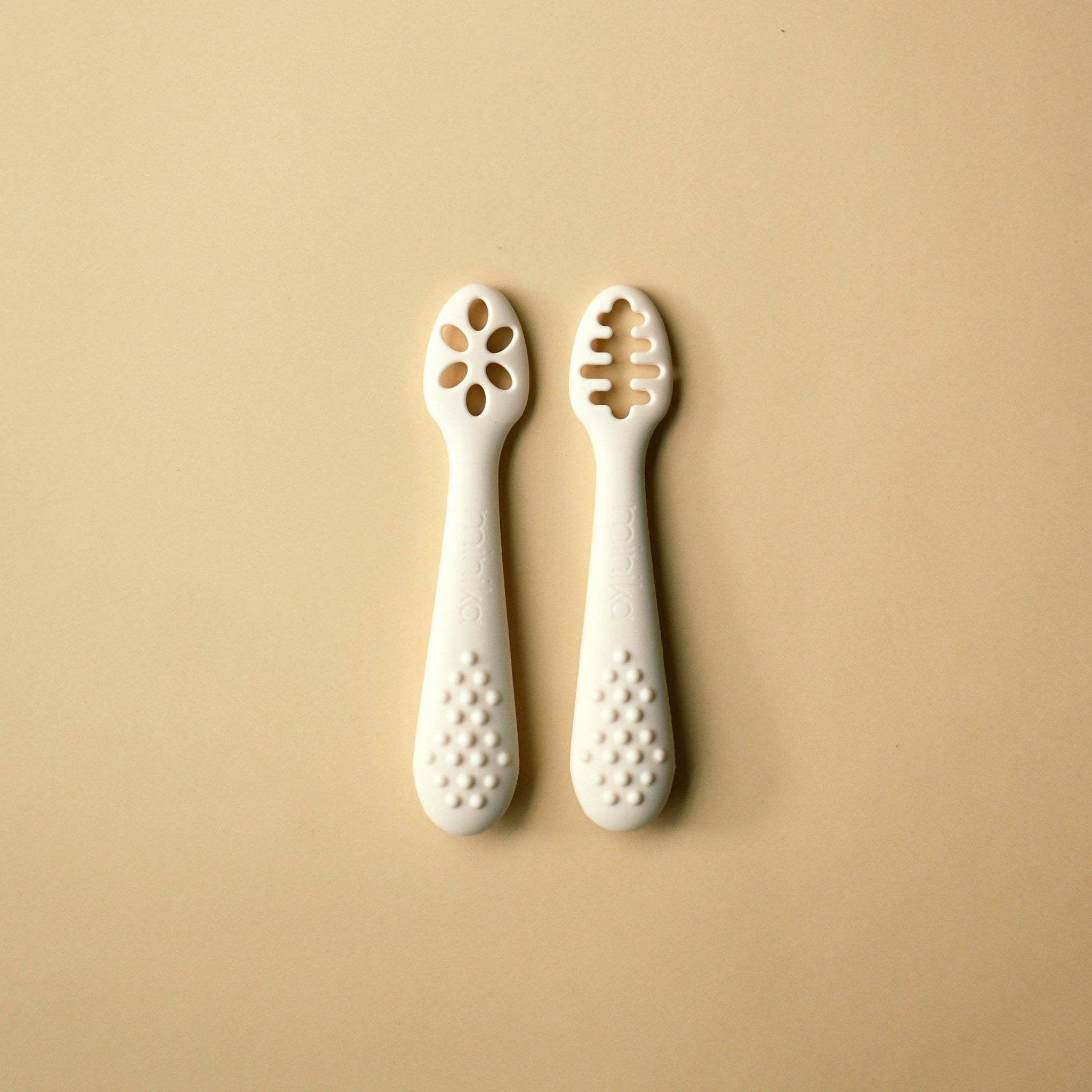 First feeding spoons - Pack of 2. * Made with 100% food grade silicone * Recommended for ages 6m + * BPA, BPS, Phtalate and PVC free * 11.5cm x 2.1cm * Dishwasher safe * Made in China * Suggested retail price: 12$ CAD ----------------- Cuillères d'apprentissage - Ensemble de 2. * Fabriqué à partir de silicone alimentaire à 100% * Recommandé pour les bébés de 6 mois et plus * Sans BPA, BPS, Phtalate et PVC. * 11.5cm x 2.1cm * Lavable au lave-vaisselle * Fabriqué en Chine * Prix de vente recommandé: 12$ CAD